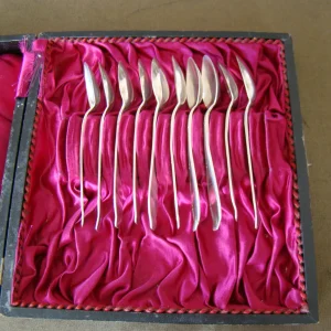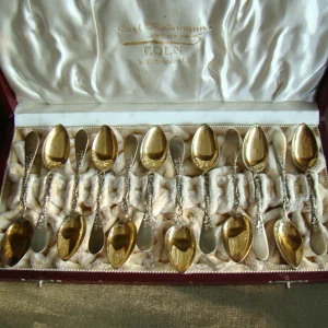 12 zilver vergulde lepeltjes floraal versierd in originele doos