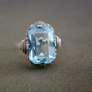 14 kt antieke wit gouden ring blauwe steen maat 17,5