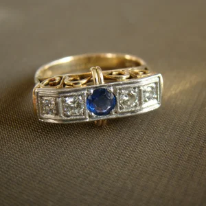 14 kt bicolor gouden antieke ring rij met saffier en ca. 0,24 diamant maat 18