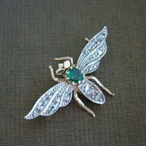 14 kt geel gouden met zilver antieke broche vorm bij met smaragd roosdiamant