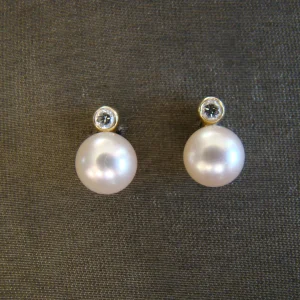 14 kt geel gouden oorbellen witte parel briljant