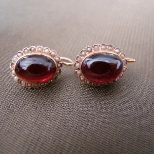 14 kt geel gouden oorbellen cabuchon granaat zaadpareltjes