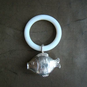 antieke bijtring met rammelaar zilveren vis