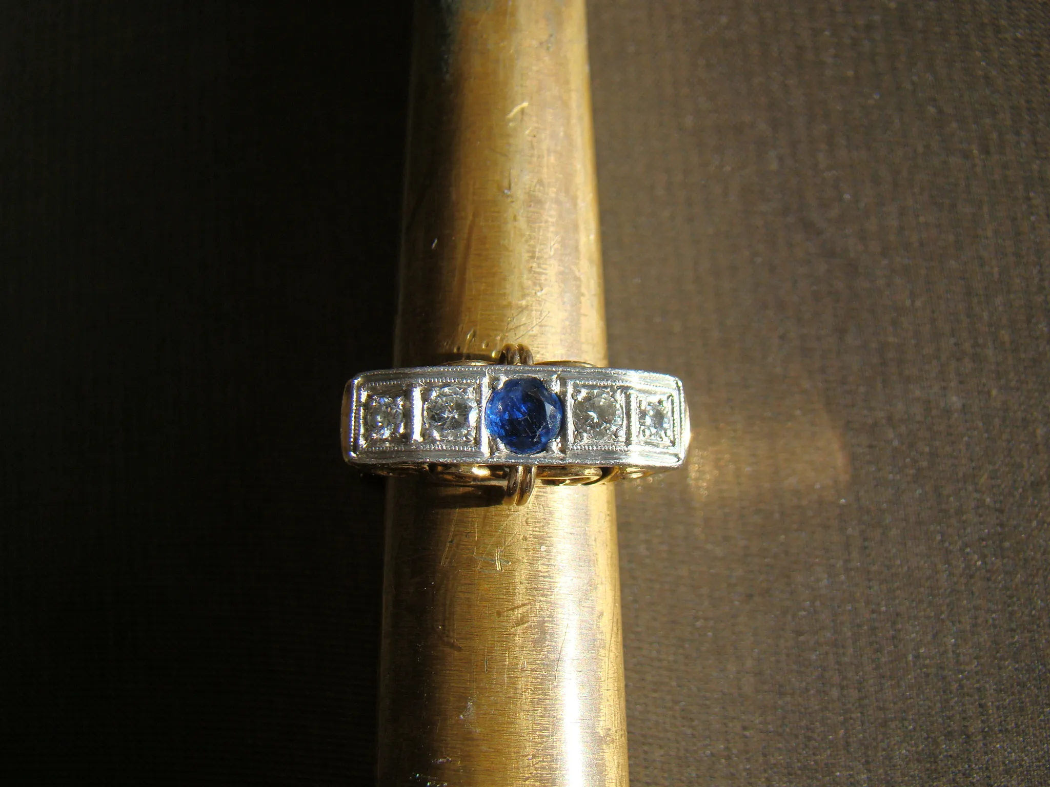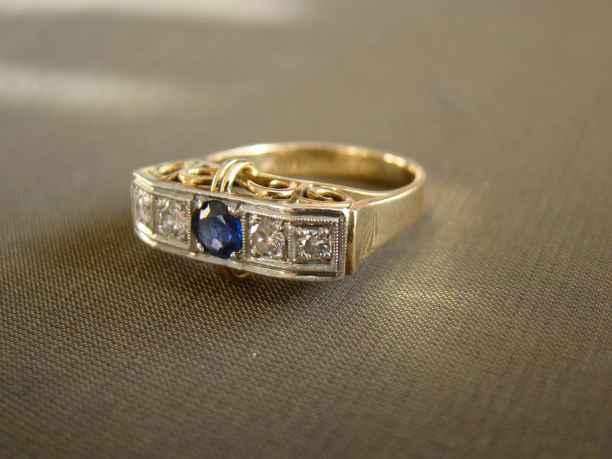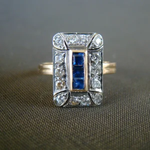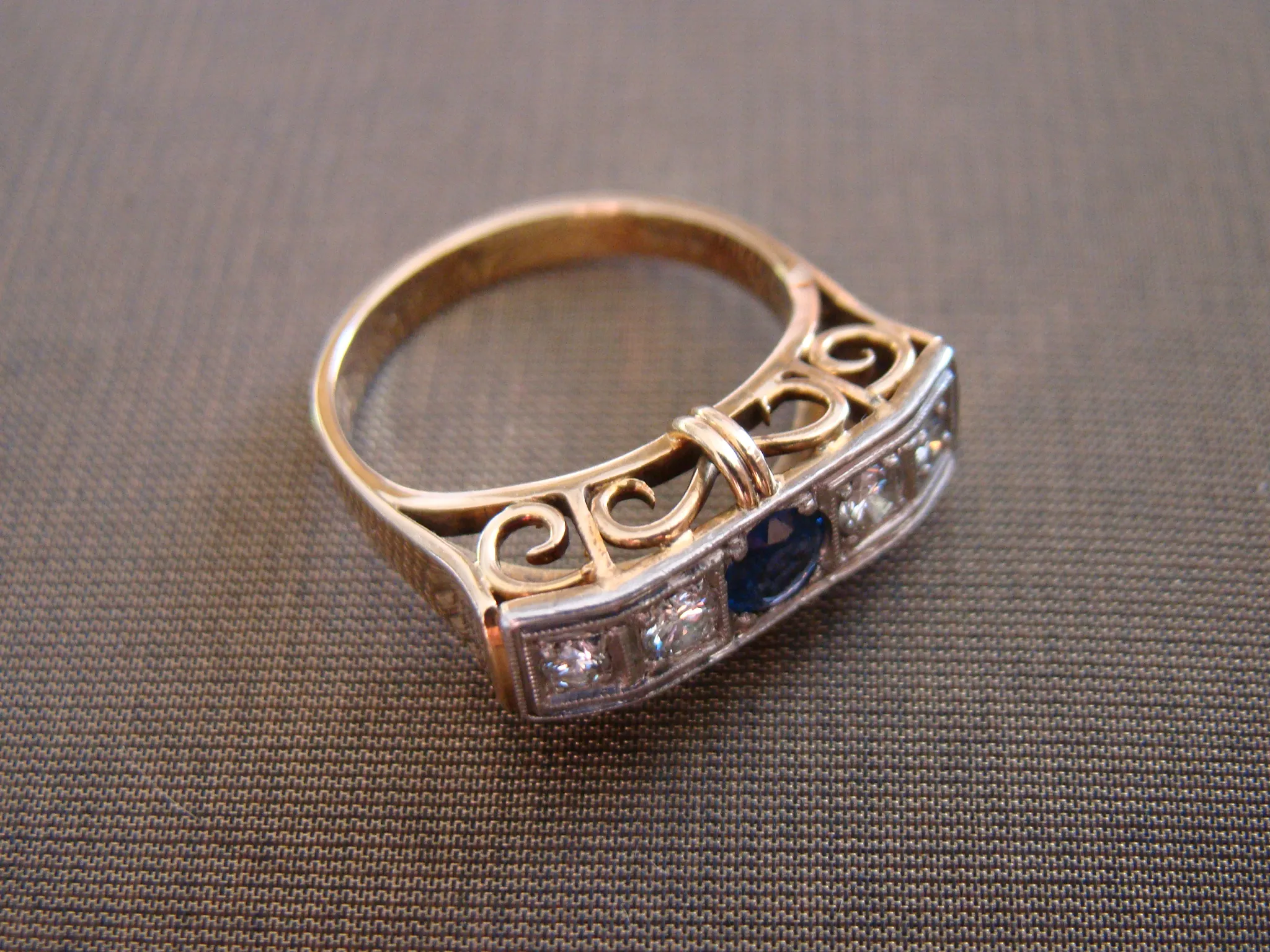 14 kt bicolor gouden antieke ring rij met saffier en ca. 0,24 diamant maat 18