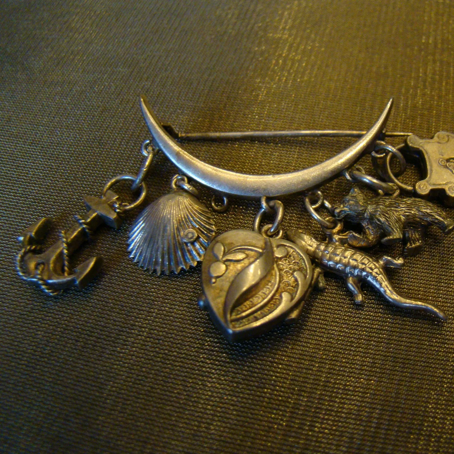 zilveren speld met diverse bedels
